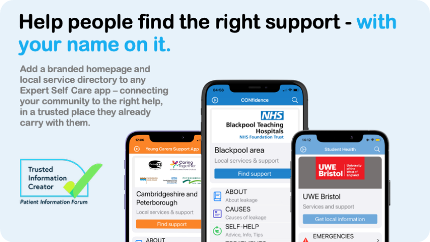 You can think of a branded Expert Self Care app not as a medical device, but as a trusted front door and pocket guide - bringing together the information and support you already provide in one calm, easy-to-use place.